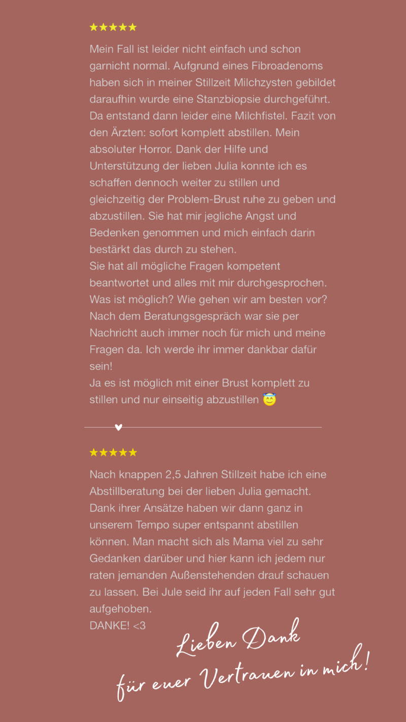 Umso mehr freue ich mich, durch meine 2024 erfolgreich abgeschlossene Ausbildung zur zertifizierten Stillberaterin andere liebe Mamis unterstützen zu dürfen. Es ist mir eine Herzensangelegenheit, werdende Mütter in der Schwangerschaft und anschließenden Stillzeit bei allen Fragen und Problemen
